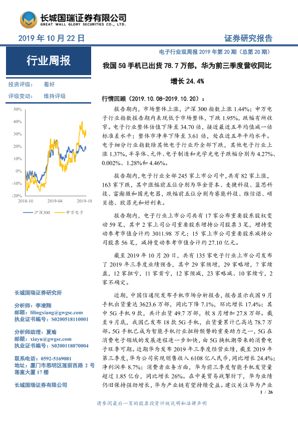 【长城国瑞证券】【20191022】电子行业双周报2019年第20期(总第20期):我国5G手机已出货78.7万部,华为前三季度营收同比增长24.4%-26页