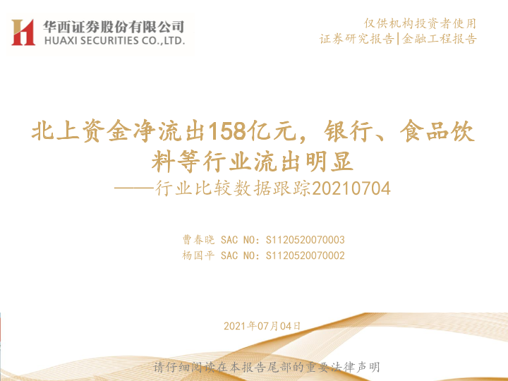 【华西证券】【20210704】行业比较数据跟踪:北上资金净流出158亿元,银行、食品饮料等行业流出明显-23页