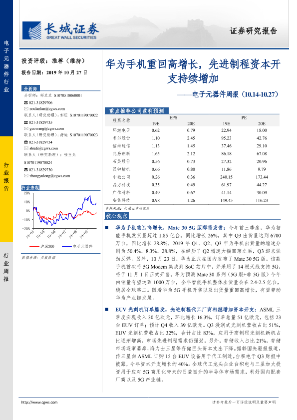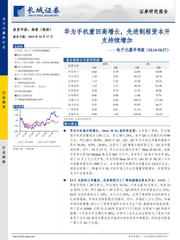 【长城证券】【20191027】电子元器件周报:华为手机重回高增长,先进制程资本开支持续增加-24页
