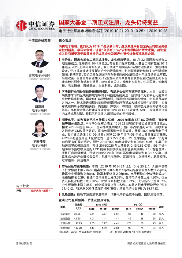 【中信证券】【20191028】电子行业每周市场动态追踪:国家大基金二期正式注册,龙头仍将受益-16页