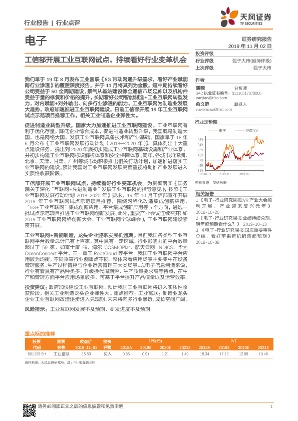 【天风证券】【20191102】电子行业点评:工信部开展工业互联网试点,持续看好行业变革机会-9页