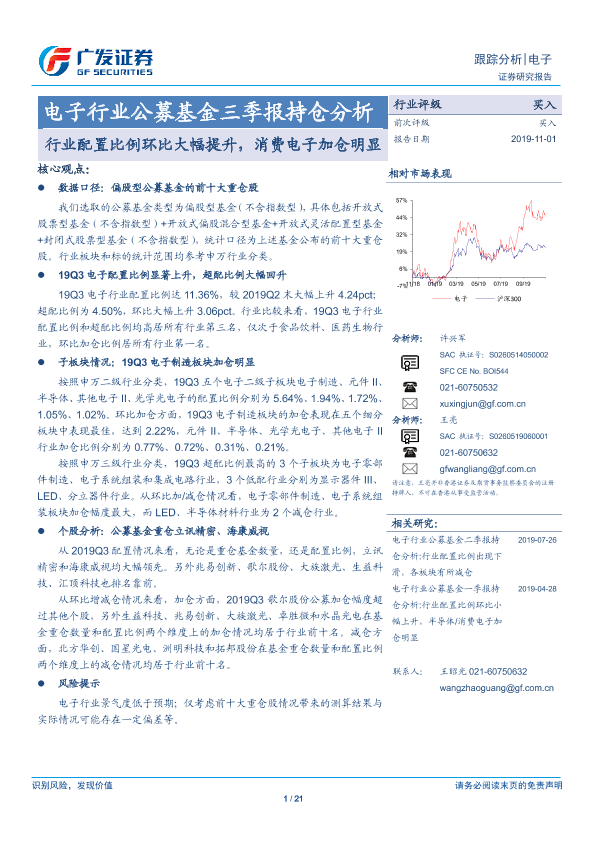 【广发证券】【20191101】电子行业公募基金三季报持仓分析:行业配置比例环比大幅提升,消费电子加仓明显-21页