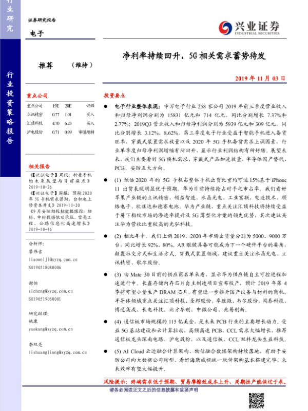 【兴业证券】【20191103】净利率持续回升,5G相关需求蓄势待发-16页