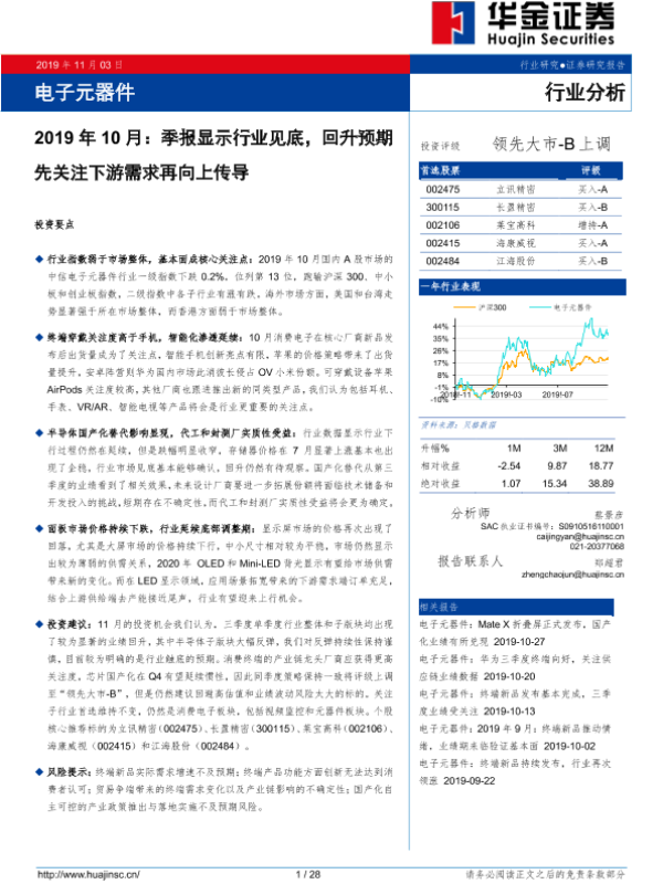 【华金证券】【20191103】电子元器件行业分析2019年10月:季报显示行业见底,回升预期先关注下游需求再向上传导-28页