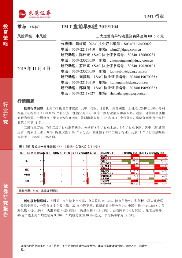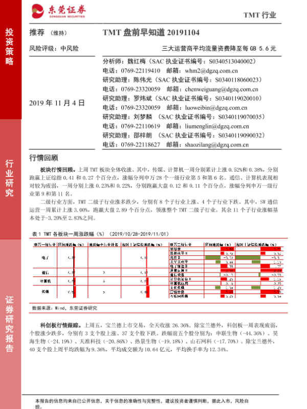 【东莞证券】【20191104】TMT盘前早知道:三大运营商平均流量资费降至每GB5.6元-6页