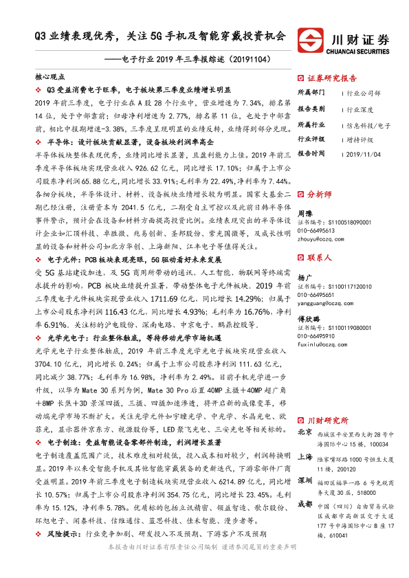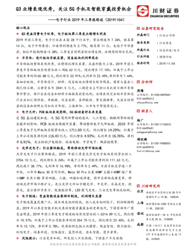 【川财证券】【20191104】电子行业2019年三季报综述:Q3业绩表现优秀,关注5G手机及智能穿戴投资机会-23页
