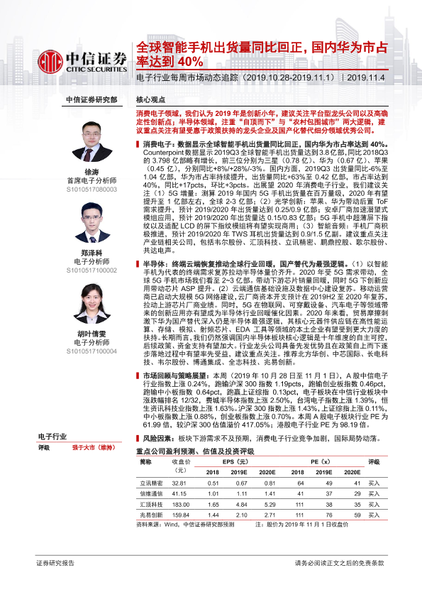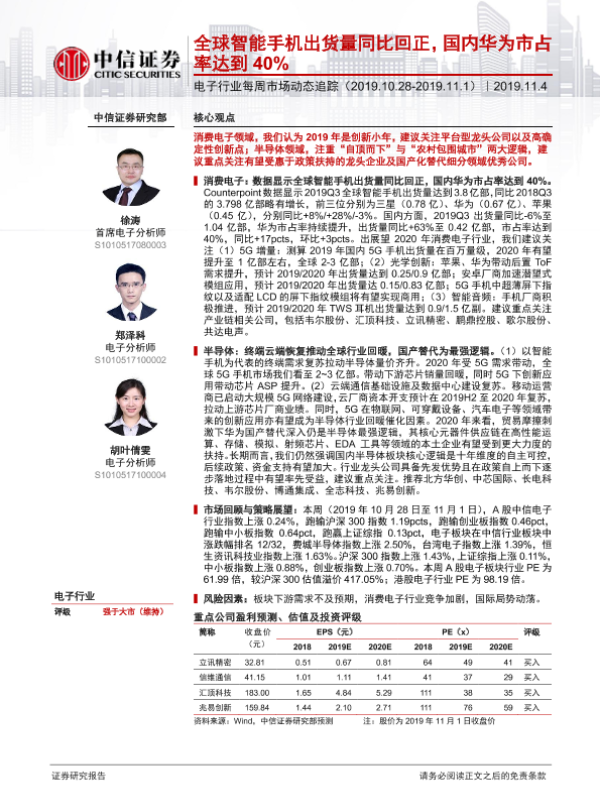 【中信证券】【20191104】电子行业每周市场动态追踪:全球智能手机出货量同比回正,国内华为市占率达到40%-16页