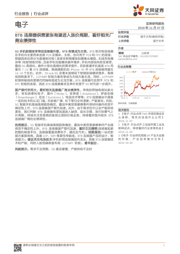 【天风证券】【20191107】电子行业点评:BTB连接器供需紧张有望进入涨价周期,看好相关厂商业绩弹性-2页