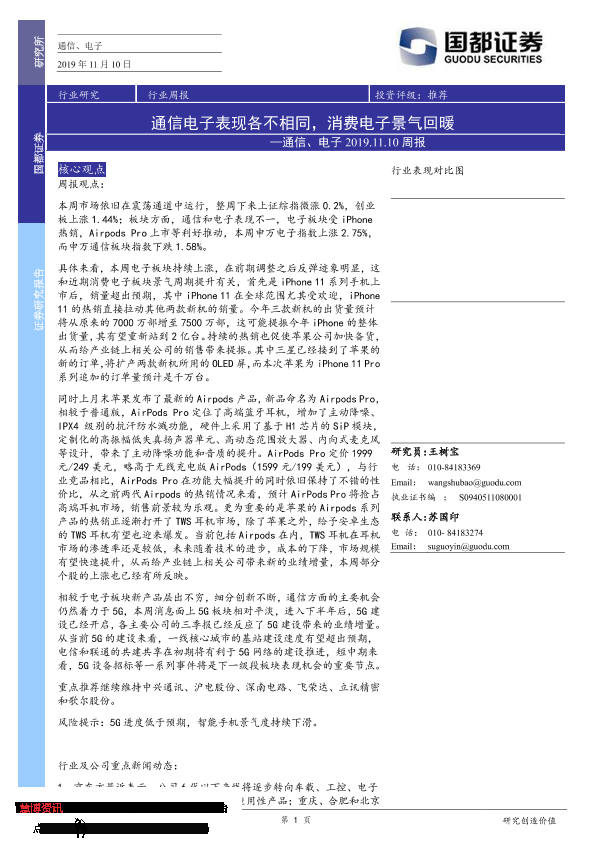 【国都证券】【20191110】通信、电子周报:通信电子表现各不相同,消费电子景气回暖-3页