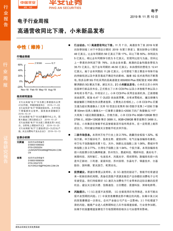 【平安证券】【20191110】20191110-平安证券-电子行业周报:高通营收同比下滑,小米新品发布-5页