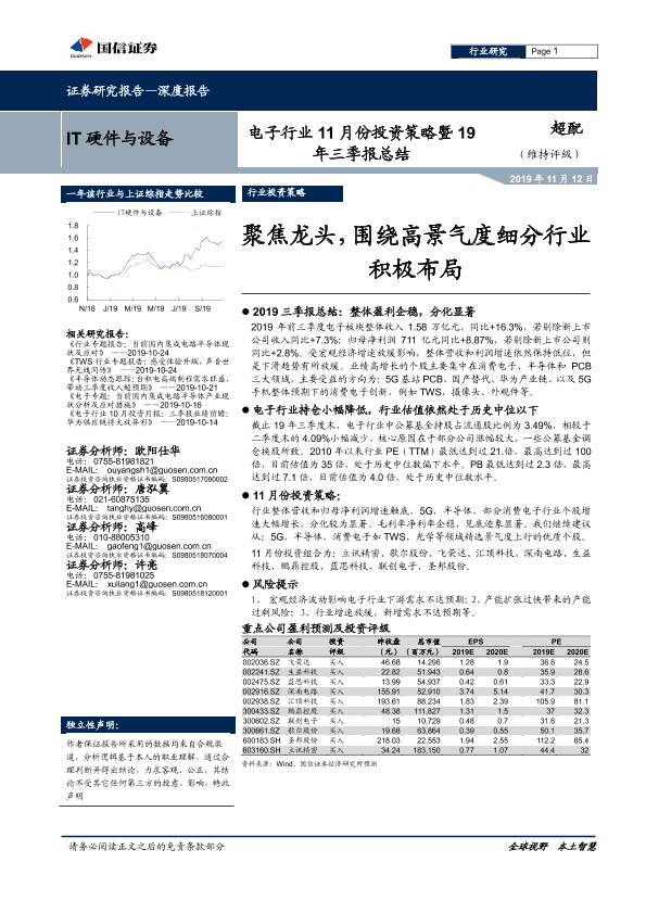 【国信证券】【20191112】电子行业11月份投资策略暨19年三季报总结:聚焦龙头,围绕高景气度细分行业积极布局-13页