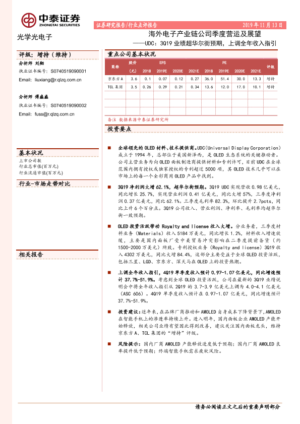 【中泰证券】【20191113】海外电子产业链公司季度营运及展望:UDC:3Q19业绩超华尔街预期,上调全年收入指引-7页