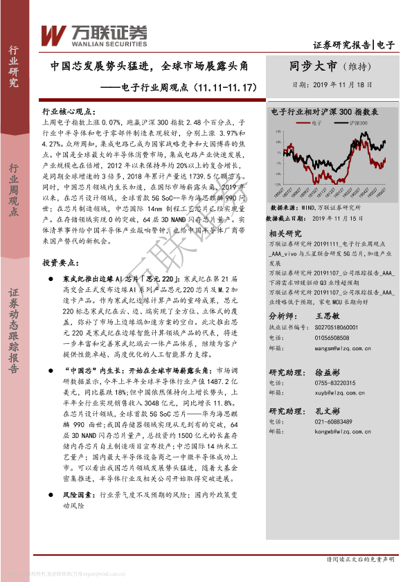 【万联证券】【20191118】20191118-万联证券-电子行业周观点:中国芯发展势头猛进,全球市场展露头角-11页