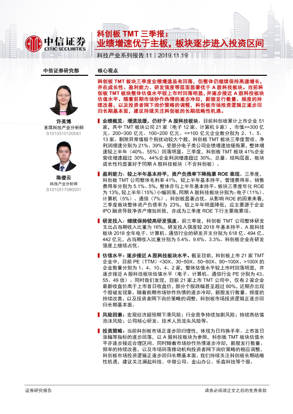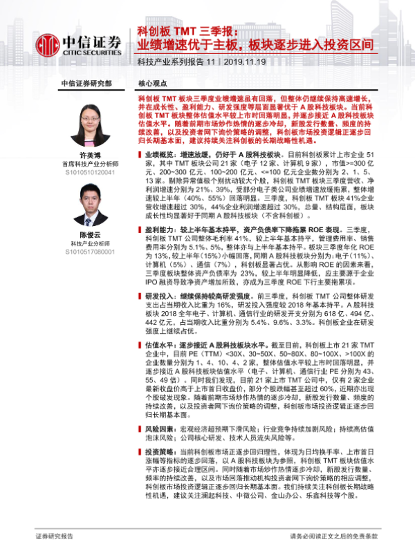 【中信证券】【20191119】科创板TMT三季报:业绩增速优于主板,板块逐步进入投资区间-14页
