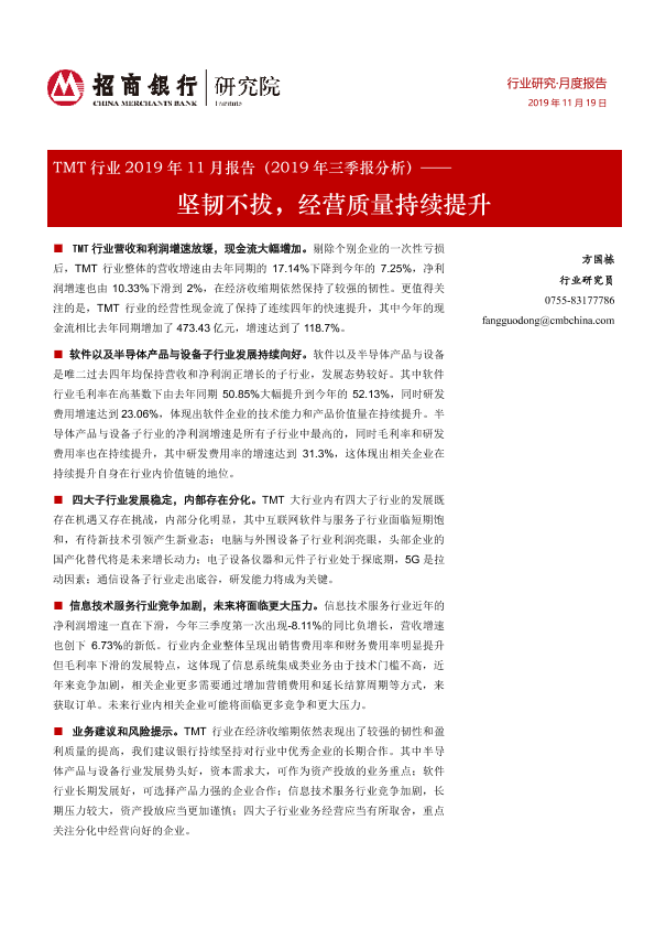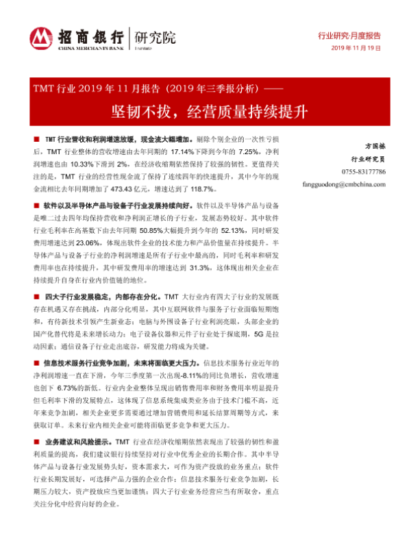 【招商银行】【20191119】TMT行业2019年11月报告(2019年三季报分析):坚韧不拔,经营质量持续提升-16页