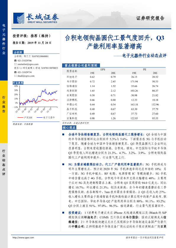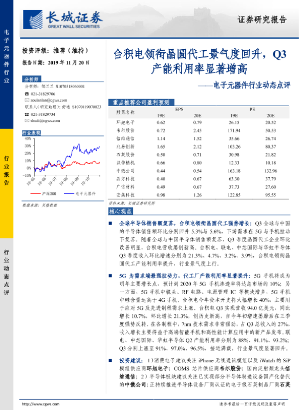 【长城证券】【20191120】20191120-长城证券-电子元器件行业动态点评:台积电领衔晶圆代工景气度回升,Q3产能利用率显著增高-10页