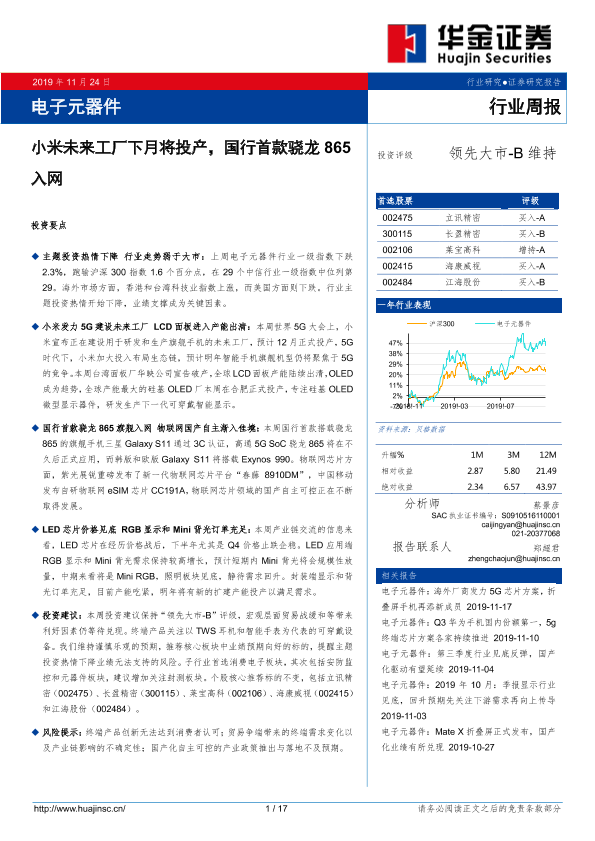 【华金证券】【20191124】20191124-华金证券-电子元器件行业周报:小米未来工厂下月将投产,国行首款骁龙865入网-17页