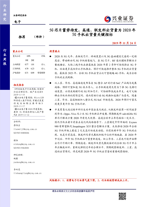 【兴业证券】【20191124】5G芯片蓄势待发,高通、联发科出货量为2020年5G手机出货量关键指标-11页