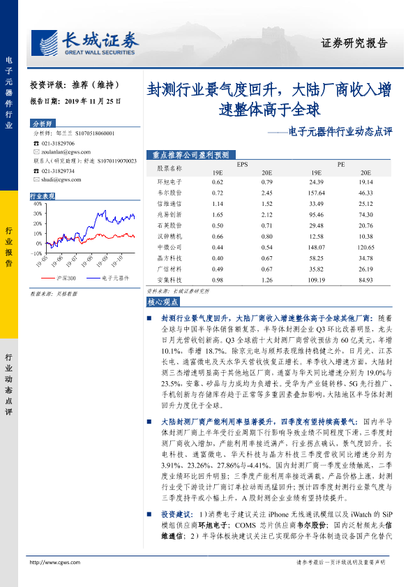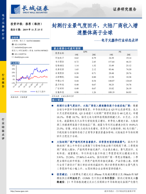 【长城证券】【20191125】电子元器件行业动态点评:封测行业景气度回升,大陆厂商收入增速整体高于全球-11页