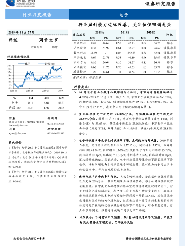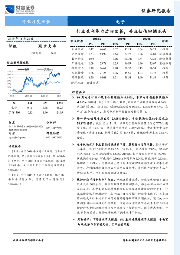 【财信证券】【20191127】电子行业月度报告:行业盈利能力边际改善,关注估值回调龙头-16页