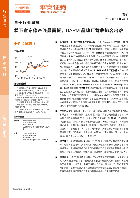 【平安证券】【20191126】电子行业周报:松下宣布停产液晶面板,DARM品牌厂营收排名出炉-5页