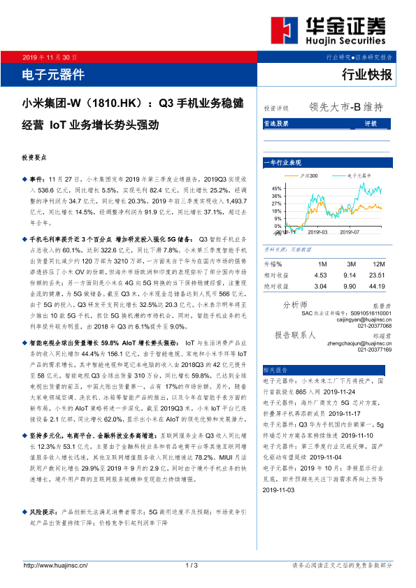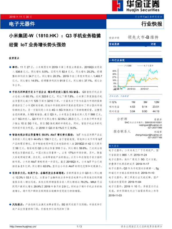 【华金证券】【20191130】小米集团-W:Q3手机业务稳健经营IOT业务增长势头强劲-3页