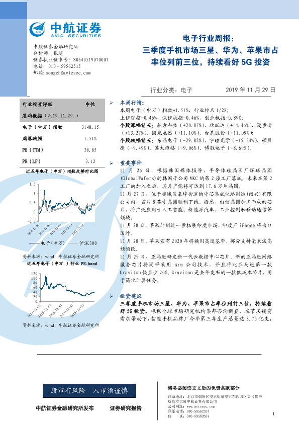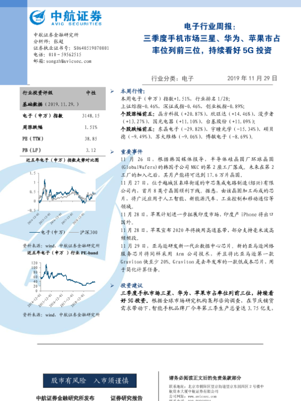 【中航证券】【20191129】电子行业周报:三季度手机市场三星、华为、苹果市占率位列前三位,持续看好5G投资-3页