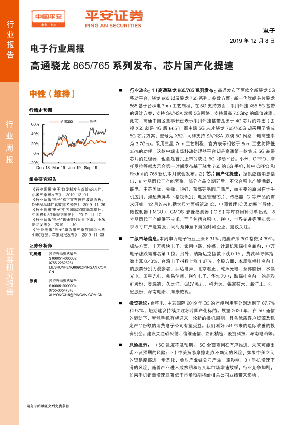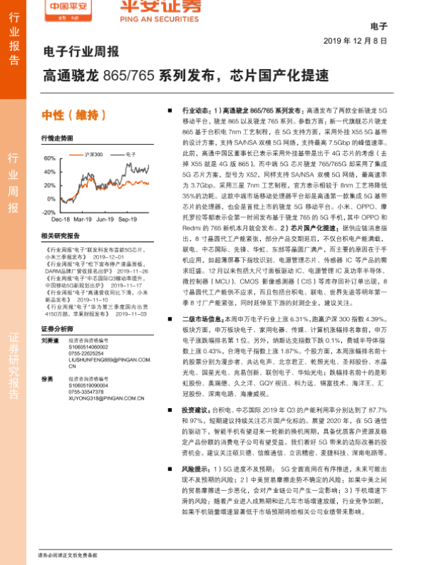 【平安证券】【20191208】电子行业周报:高通骁龙865 765系列发布,芯片国产化提速-5页