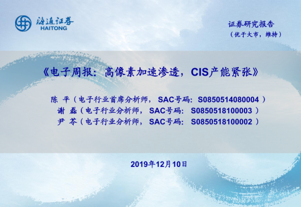 【海通证券】【20191210】电子周报:高像素加速渗透,CIS产能紧张-8页