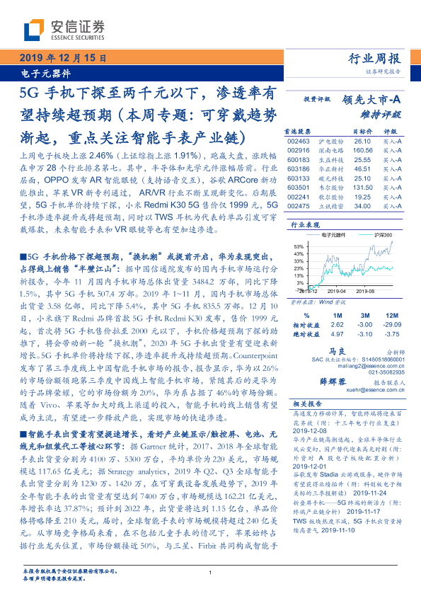 【安信证券】【20191215】20191215-安信证券-电子元器件行业周报:5G手机下探至两千元以下,渗透率有望持续超预期(本周专题:可穿戴趋势渐起,重点关注智能手表产业链)-18页