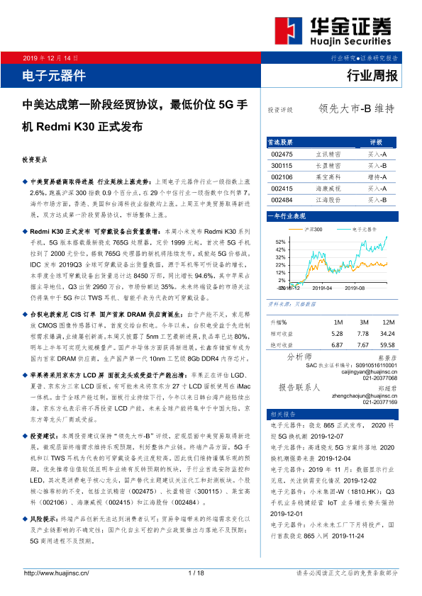 【华金证券】【20191214】20191214-华金证券-电子元器件行业周报:中美达成第一阶段经贸协议,最低价位5G手机Redmi K30正式发布-18页