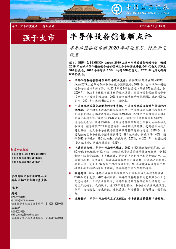 【中银证券】【20191215】半导体设备销售额2020年将迎复苏,行业景气恢复-4页