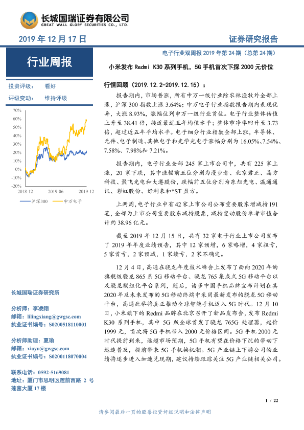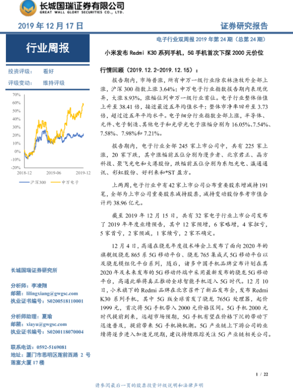 【长城国瑞证券】【20191217】20191217-长城国瑞证券-电子行业双周报2019年第24期(总第24期):小米发布Redmi K30系列手机,5G手机首次下探2000元价位-22页