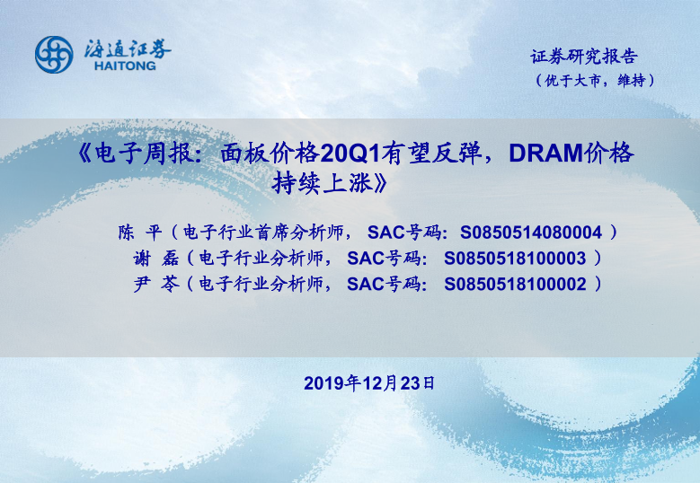 【海通证券】【20191223】电子周报:面板价格20Q1有望反弹,DRAM价格持续上涨-8页