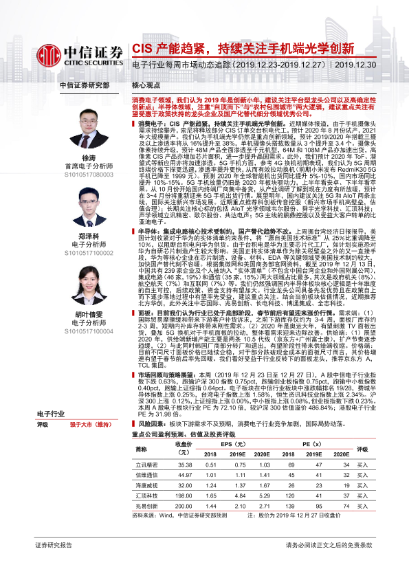 【中信证券】【20191230】电子行业每周市场动态追踪:CIS产能趋紧,持续关注手机端光学创新-19页