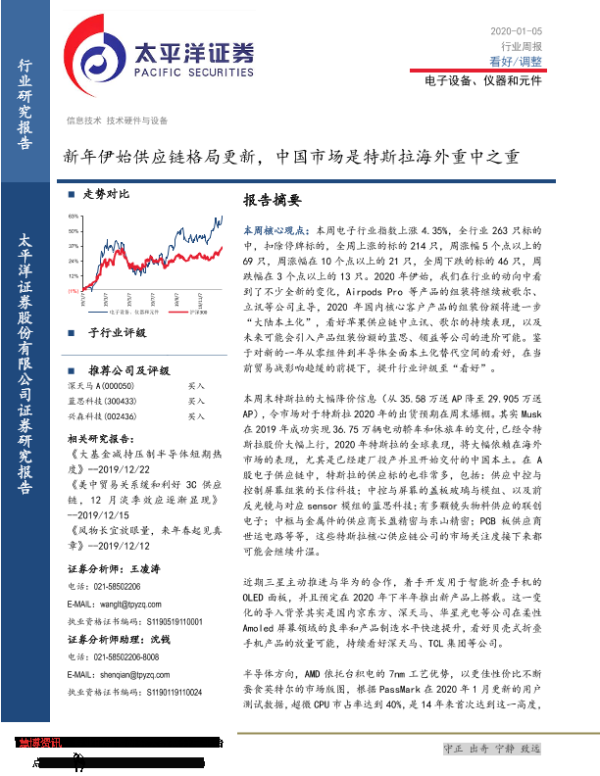 【太平洋证券】【20200105】20200105-太平洋-电子设备、仪器和元件行业周报:新年伊始供应链格局更新,中国市场是特斯拉海外重中之重-15页