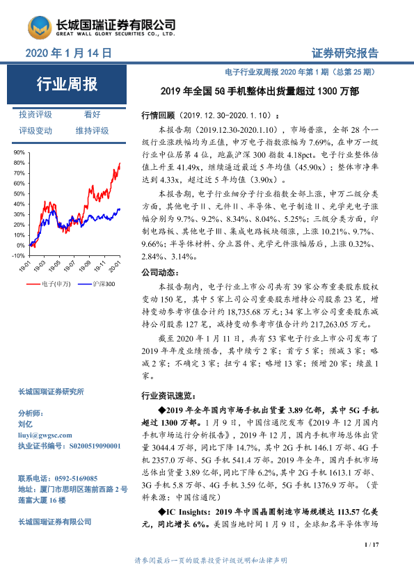 【长城国瑞证券】【20200114】电子行业双周报2020年第1期(总第25期):2019年全国5G手机整体出货量超过1300万部-17页