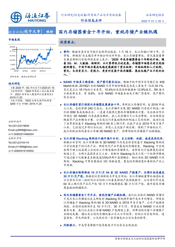 【海通证券】【20200120】20200120-海通证券-半导体产品与半导体设备行业信息点评:国内存储器黄金十年开始,重视存储产业链机遇-2页