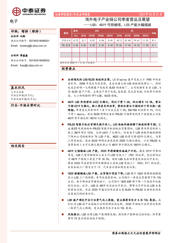 【中泰证券】【20200201】海外电子产业链公司季度营运及展望——LGD:4Q19亏损继续,LCD产能大幅缩减-8页