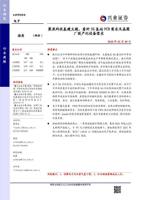 【兴业证券】【20200209】20200209-兴业证券-电子行业周报:聚焦科技基建主题,看好5G基站PCB需求及晶圆厂国产化设备需求-10页