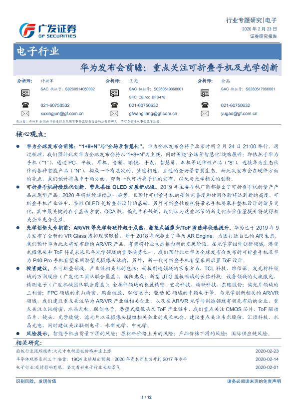 【广发证券】【20200223】电子行业:华为发布会前瞻:重点关注可折叠手机及光学创新-12页