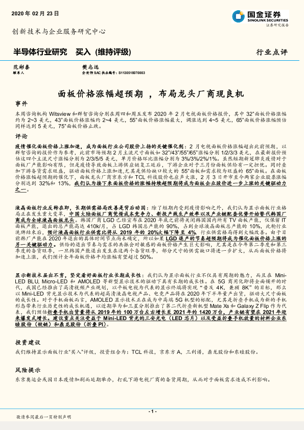 【国金证券】【20200223】半导体行业研究:面板价格涨幅超预期,布局龙头厂商现良机-3页