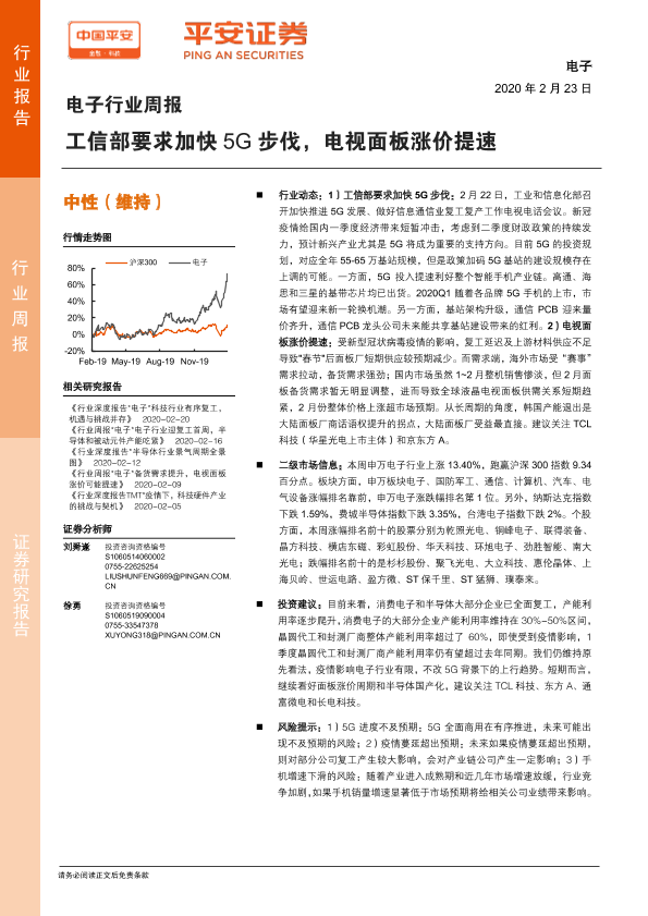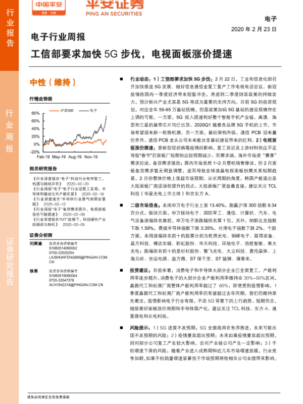 【平安证券】【20200223】电子行业周报:工信部要求加快5G步伐,电视面板涨价提速-5页