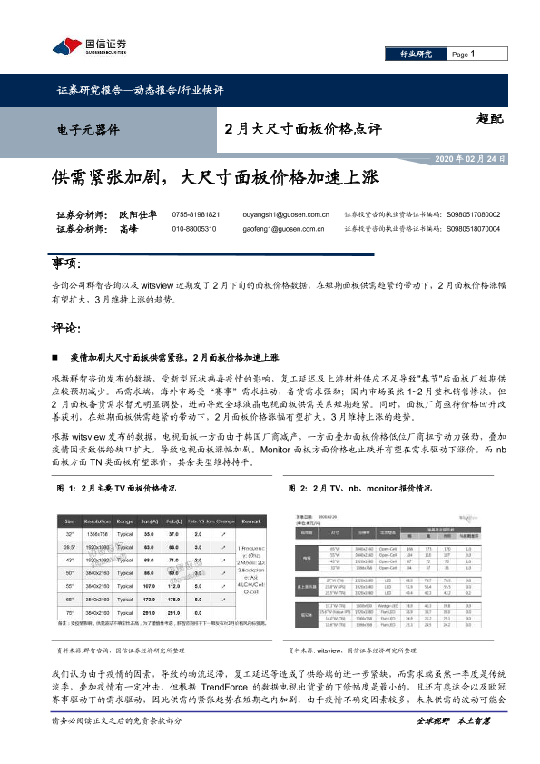 【国信证券】【20200224】2月大尺寸面板价格点评:供需紧张加剧,大尺寸面板价格加速上涨-5页