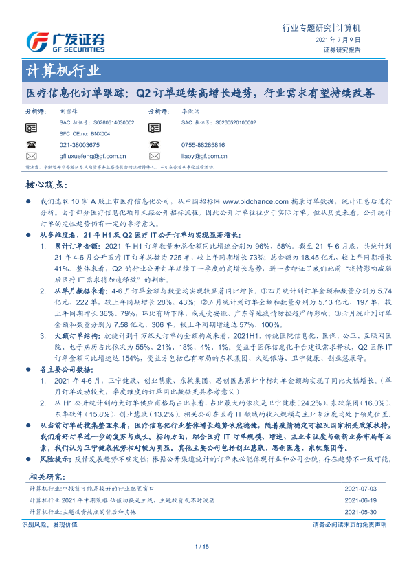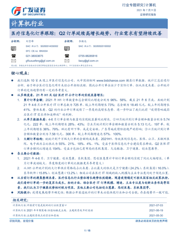 【广发证券】【20210709】计算机行业医疗信息化订单跟踪:Q2订单延续高增长趋势,行业需求有望持续改善-15页