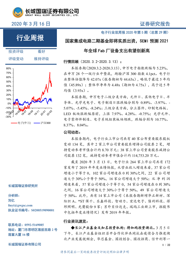 【长城国瑞证券】【20200316】电子行业双周报2020年第5期(总第29期):国家集成电路二期基金即将实质出资,SEMI预测2021年全球Fab厂设备支出有望创新高-22页