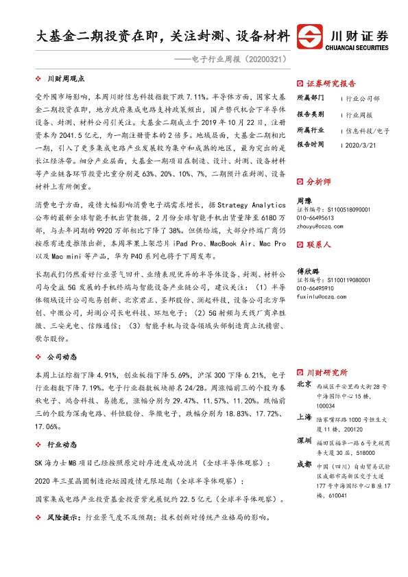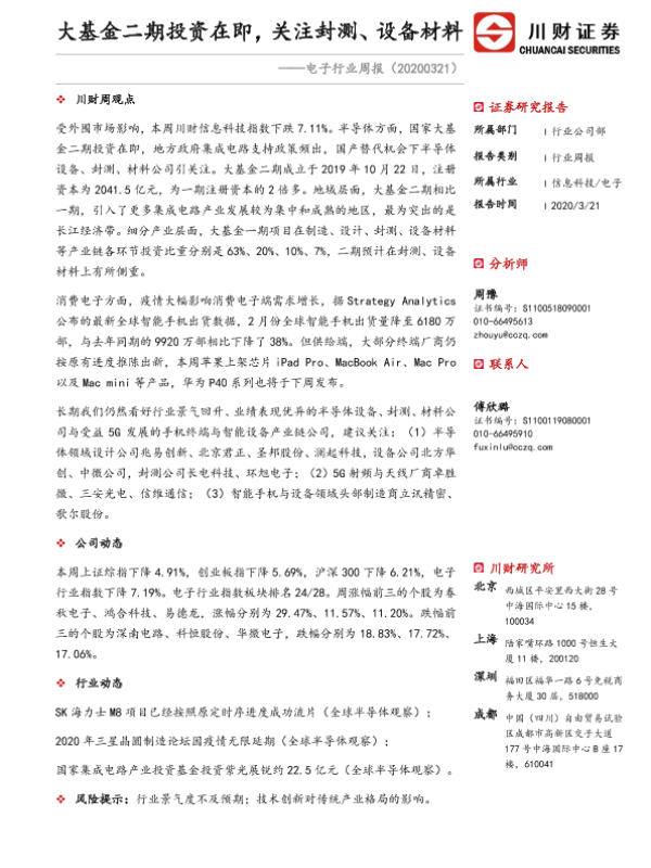 【川财证券】【20200321】电子行业周报:大基金二期投资在即,关注封测、设备材料-10页