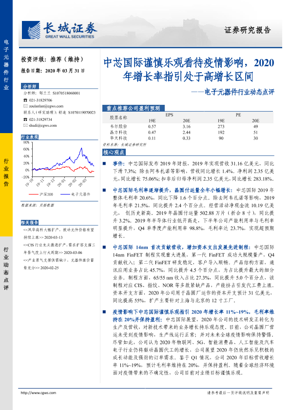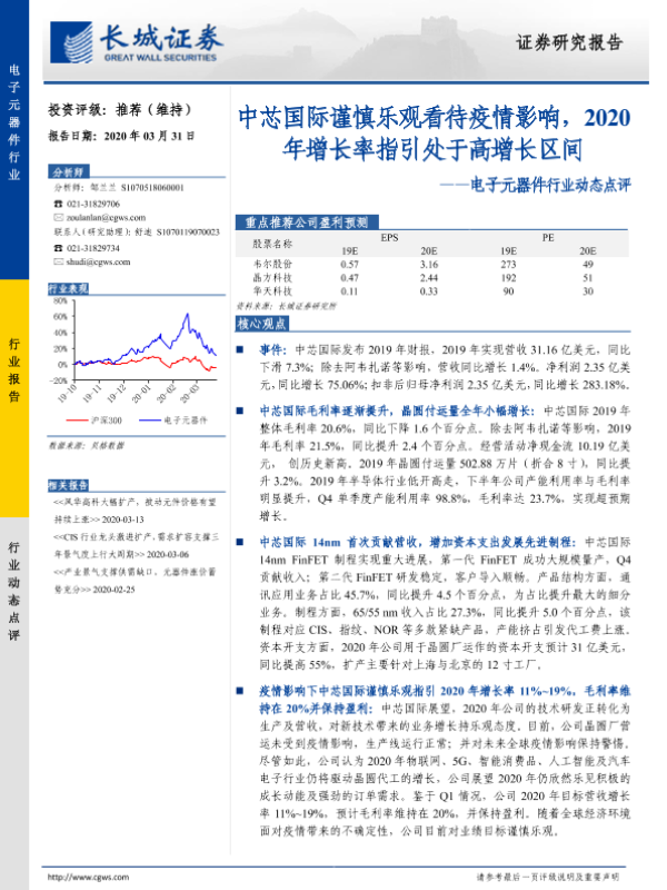 【长城证券】【20200331】20200331-长城证券-电子元器件行业动态点评:中芯国际谨慎乐观看待疫情影响,2020年增长率指引处于高增长区间-3页