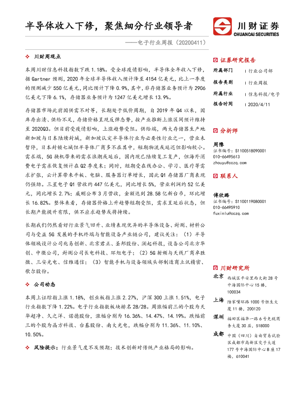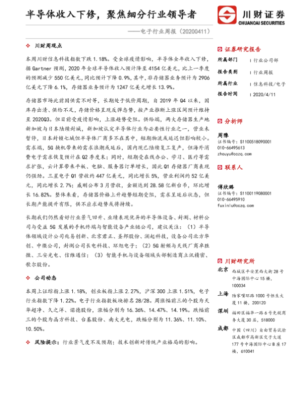 【川财证券】【20200411】电子行业周报:半导体收入下修,聚焦细分行业领导者-12页