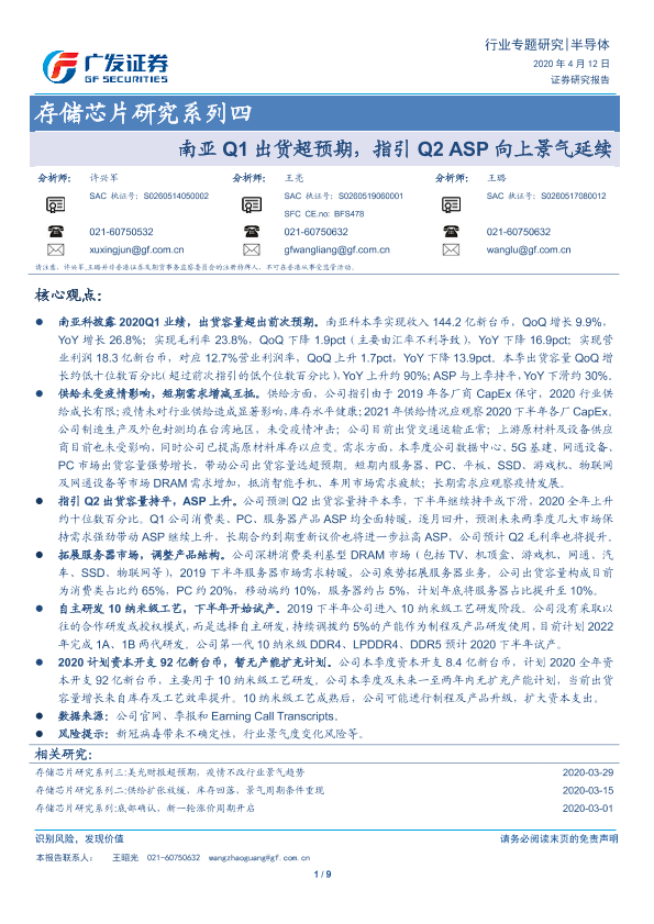 【广发证券】【20200412】20200412-广发证券-存储芯片研究系列四:南亚Q1出货超预期,指引Q2 ASP向上景气延续-9页